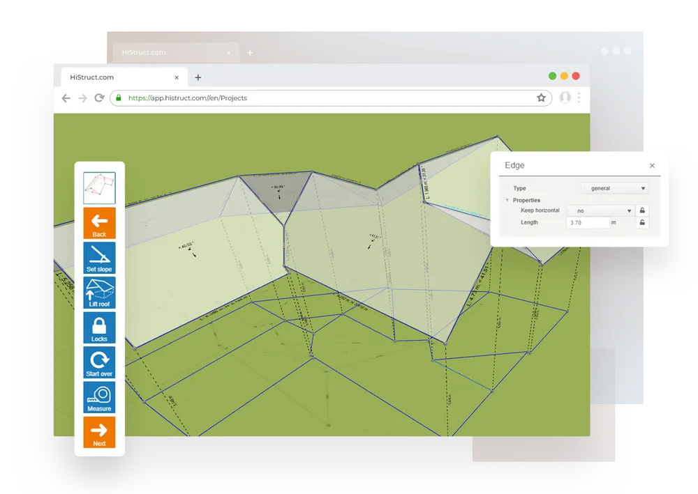 Narzędzie rozwiązywania wiązań dachowych utrzymuje spójną geometrię dachu i koryguje wszelkie dane wejściowe. Użytkownicy mogą edytować nachylenie płaszczyzny dachu, długości krawędzi (w tym krawędzie współdzielone), poziome wyrównanie okapów i kalenic oraz ich wysokości.